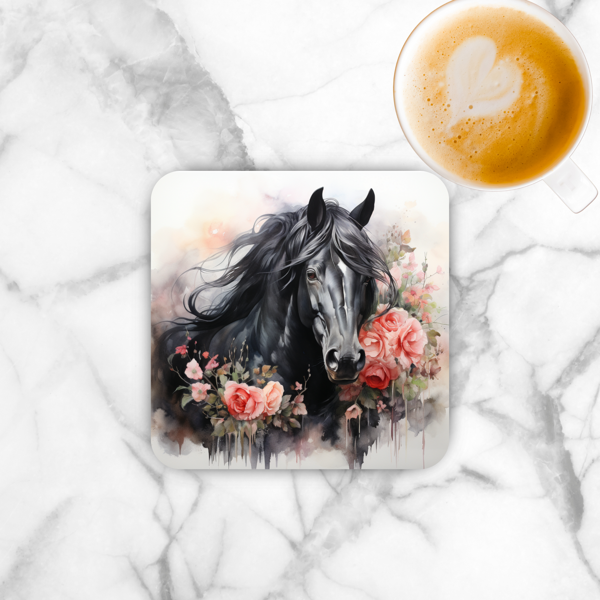 Onderzetter - paard zwart met roze bloemen